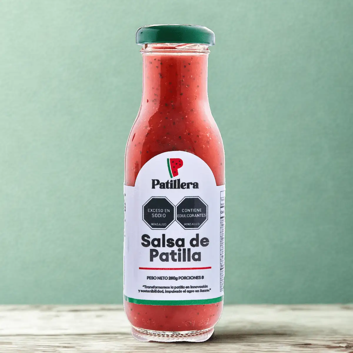 Una salsa única hecha con patilla, ideal para realzar carnes, quesos y platos gourmet con un toque dulce y fresco. Innovación y sabor en cada gota.